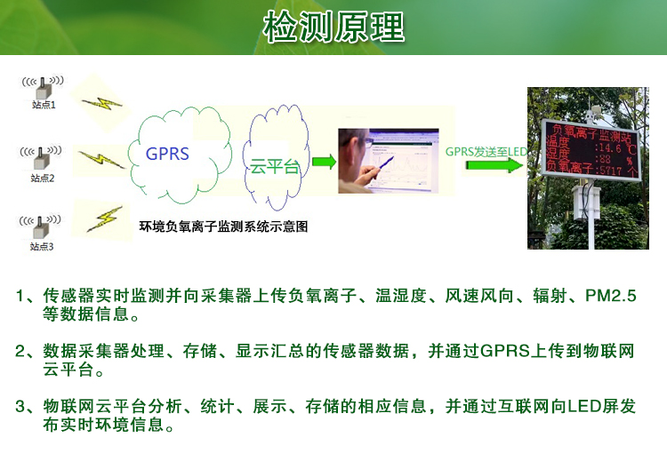 負氧離子監測系統是一款對旅游景區及生態園區內(如人工濕地、生態景區、植物園等)的空氣清潔度指標數據進行全天候自動在線采集的監測站,它是將景區負氧離子、空氣溫度、濕度、PM2.5等環境質量參數,通過自動監測設備實時監測,將監測數據通過GPRS、互聯網等方式傳輸到網絡監控軟件平臺,經過軟件平臺的系統性處理后再通過LED顯示屏直觀、快捷的展現給用戶。